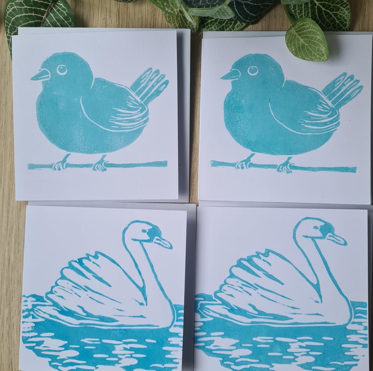 Pack of four notecards, each individually handprinted from my own linocut designs. They are all printed in a pretty pale blue colour. These can be used as thank you cards or as a note with a gift and also look great framed.