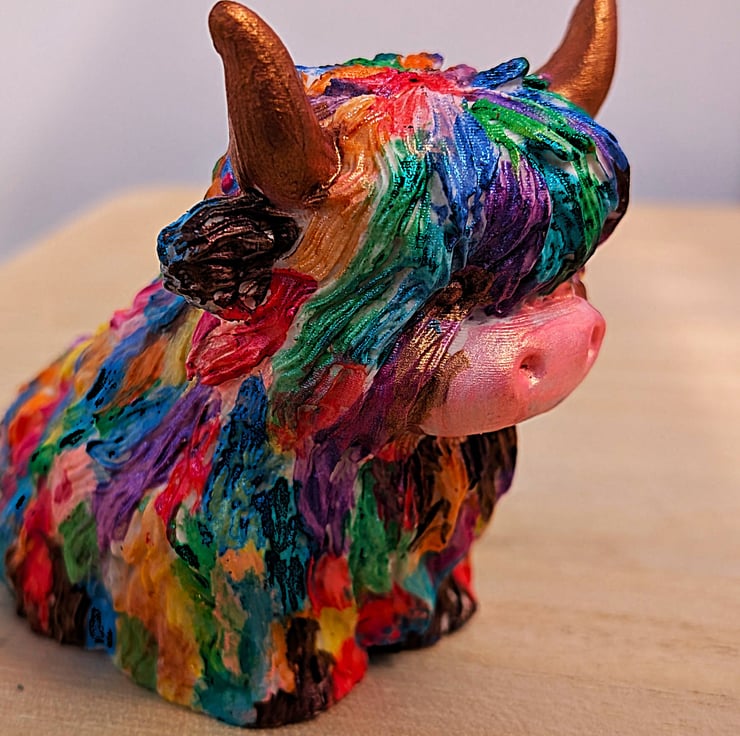 This colourful little Highland Cow is an absolute joy to behold! Its small stature is more than made up for by its vibrant presence. Handmade from durable Jesmonite and lovingly painted with iridescent acrylic paint, this piece will provide many years of pleasure. It would make a wonderful wee gift, especially for animal lovers.