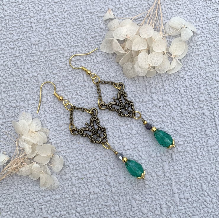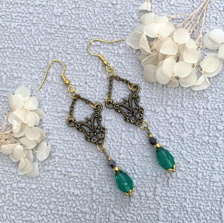 These charming earrings are made with antique bronze chandelier connectors with rich emerald green teardrop glass drop beads attached to the bottom. The earrings are finished with gold-plated ear wires and they are 8cm in total length.