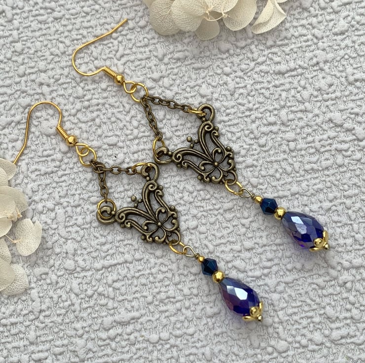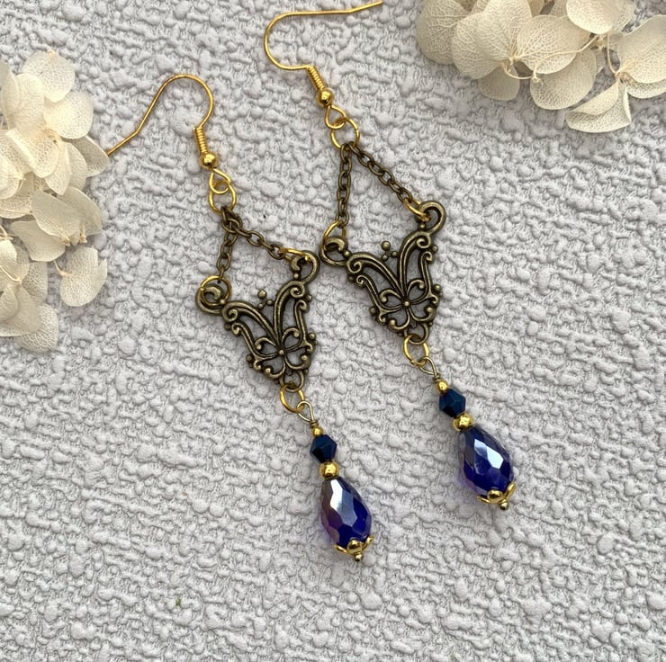 These charming earrings are made with antique bronze chandelier connectors with rich blue teardrop glass drop beads attached to the bottom. The earrings are finished with gold-plated ear wires and they are 8cm in total length.
