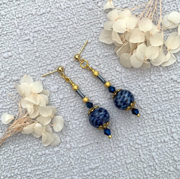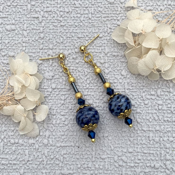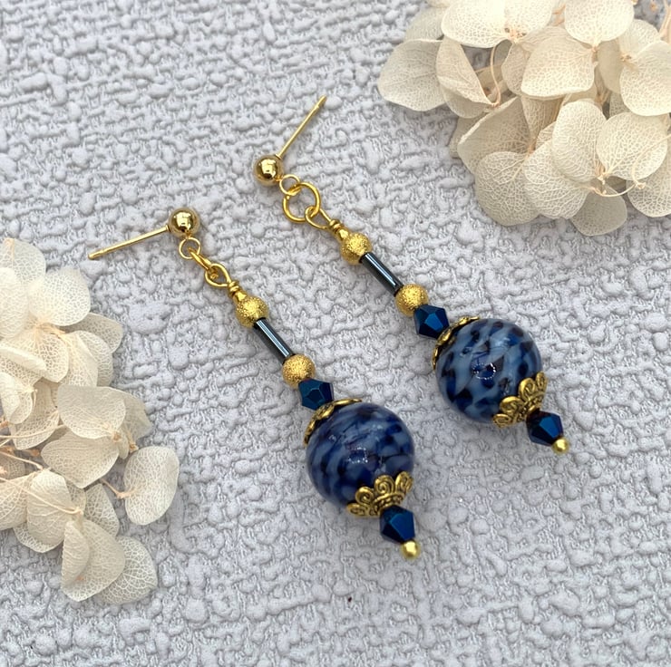 These pretty earrings are made using vintage recycled blue patterned beads as the main feature bead. The earrings include gold-plated beads, tiny glass crystal beads and are finished with gold-plate earring posts. The earrings are 4cm in total length.