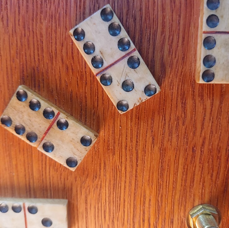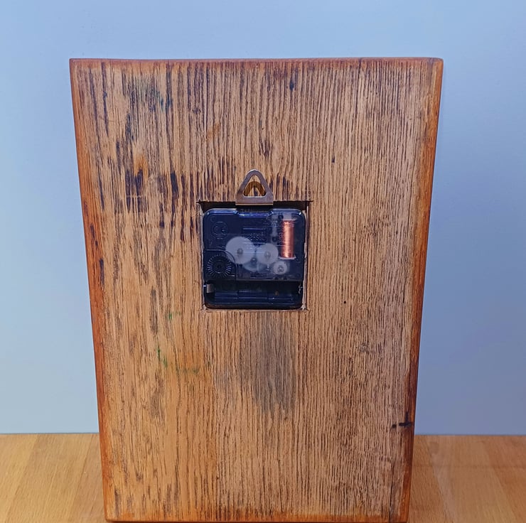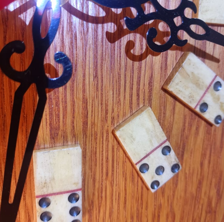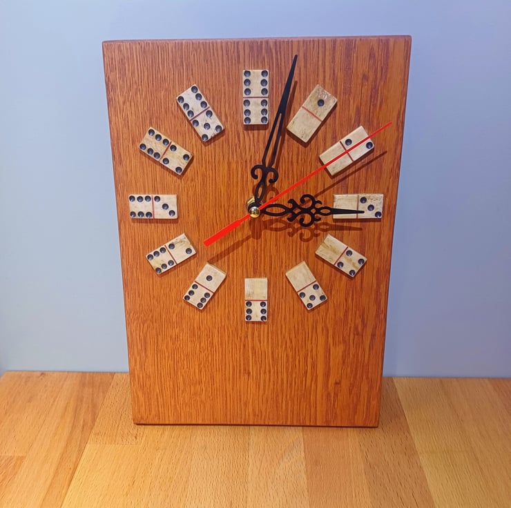 I have made this from recycled antique oak furniture which will have imperfections as it has had a previous life . The domino's are vintage bovine which will have age related marks. The clock mechanism is a modern quartz movement .size of wood approx 7.5" / 11"