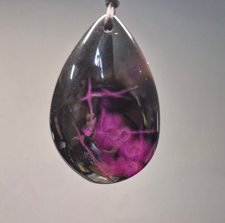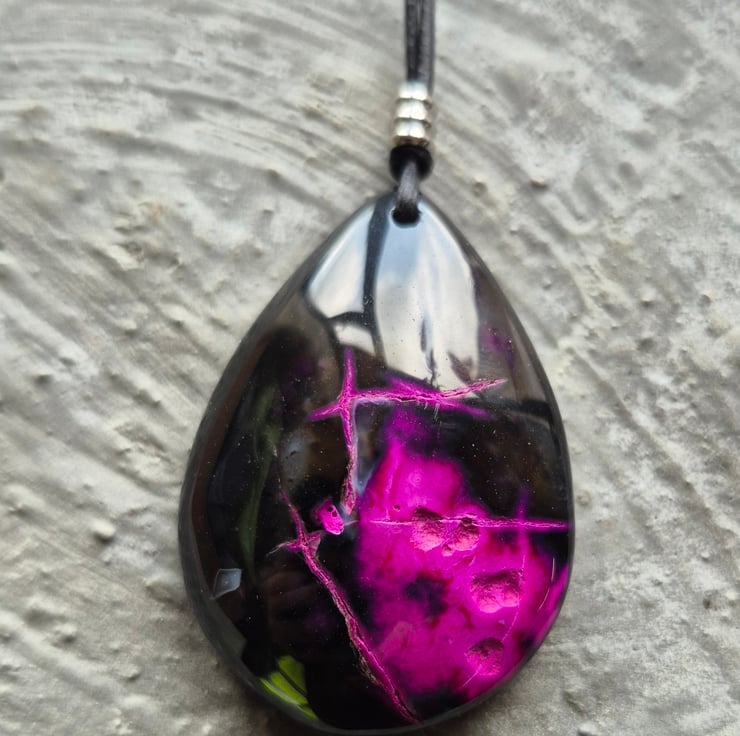 Purple and Black Fire Agate Teardrop Pendant on black leather cord with stainless steel connector and slider.