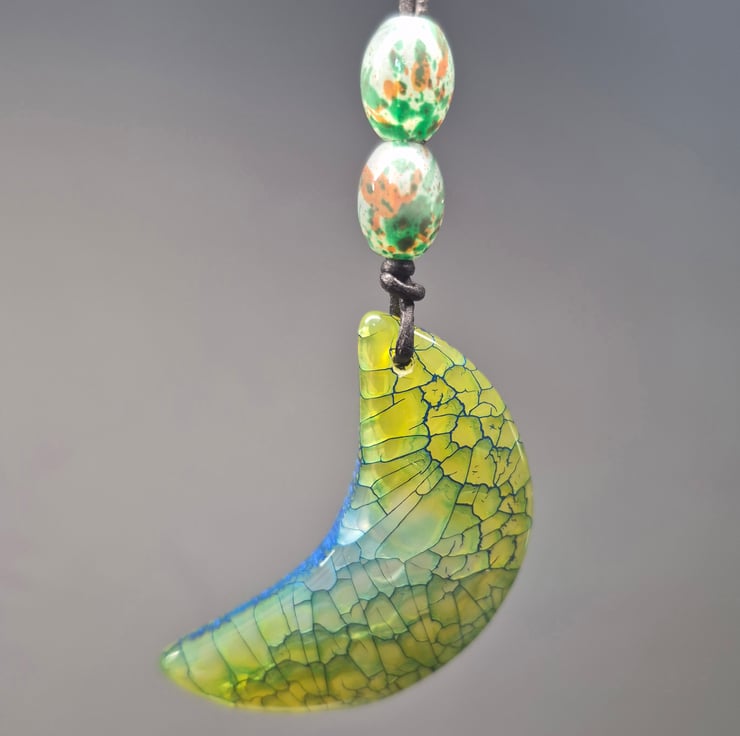 Green and blue dragon vein half moon pendant on black leather cord with matching oval slider beads.