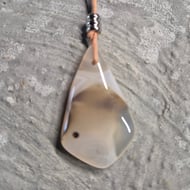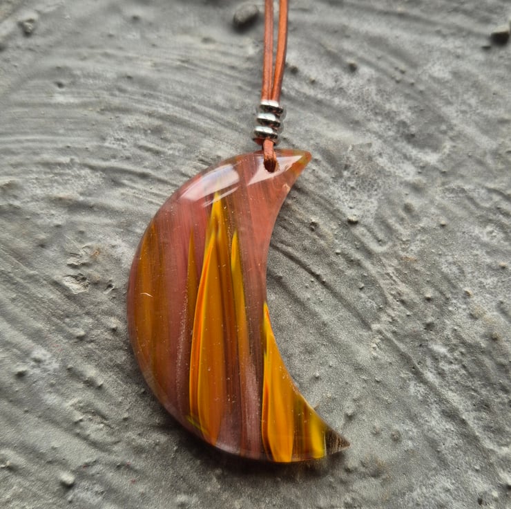 Red fire volcano cheery quartz half moon pendant on brown leather with stainless steel connector and slider.