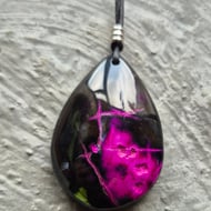 Green onyx agate teardrop pendant on black leather cord with stainless steel connector and slider.