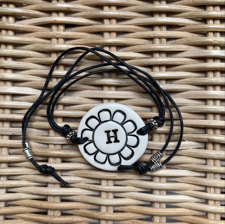 Letter 'H' Ceramic Disc tie on Bracelet with black waxed cord. I have other letters listed.