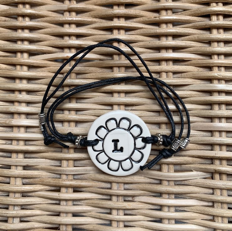 Letter 'L' Ceramic Disc tie on Bracelet with black waxed cord. I have other letters listed.