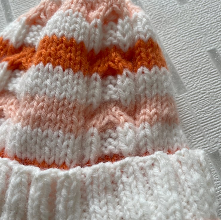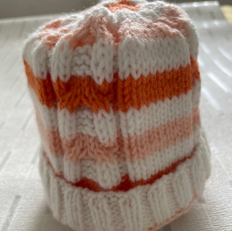 This small striped hat is hand knitted in a soft baby yarn using three colours, cream, peach and orange.