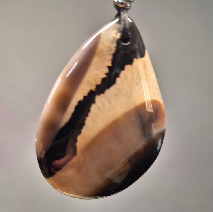 Black and white onyx druzy geode gate teardrop pendant on black leather cord with stainless steel connector and slider.