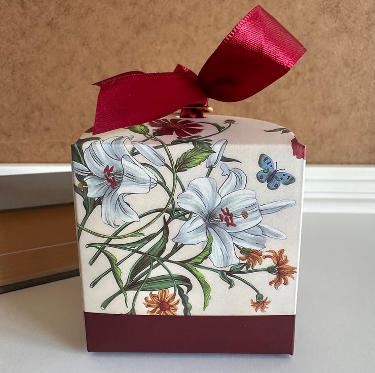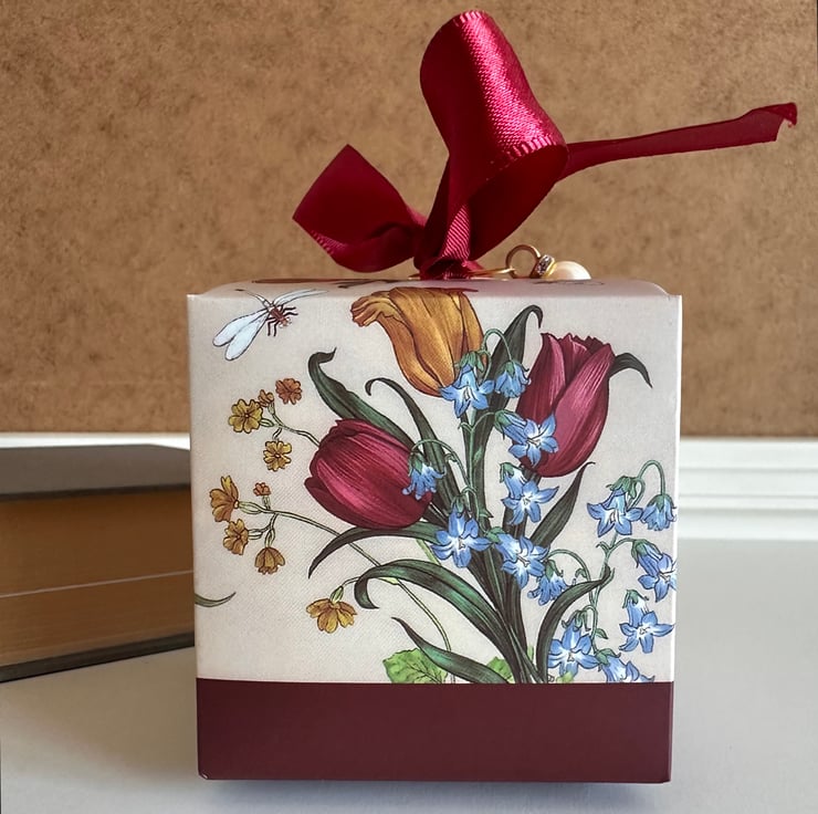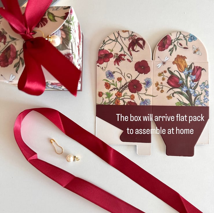 Luxurious wildflower printed paper square box with deep red satin ribbon and pearl charm.