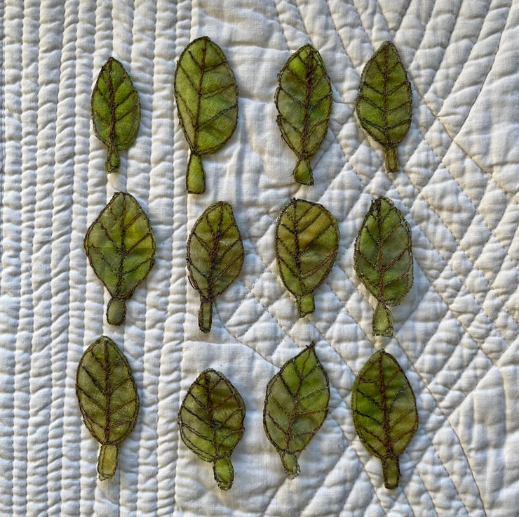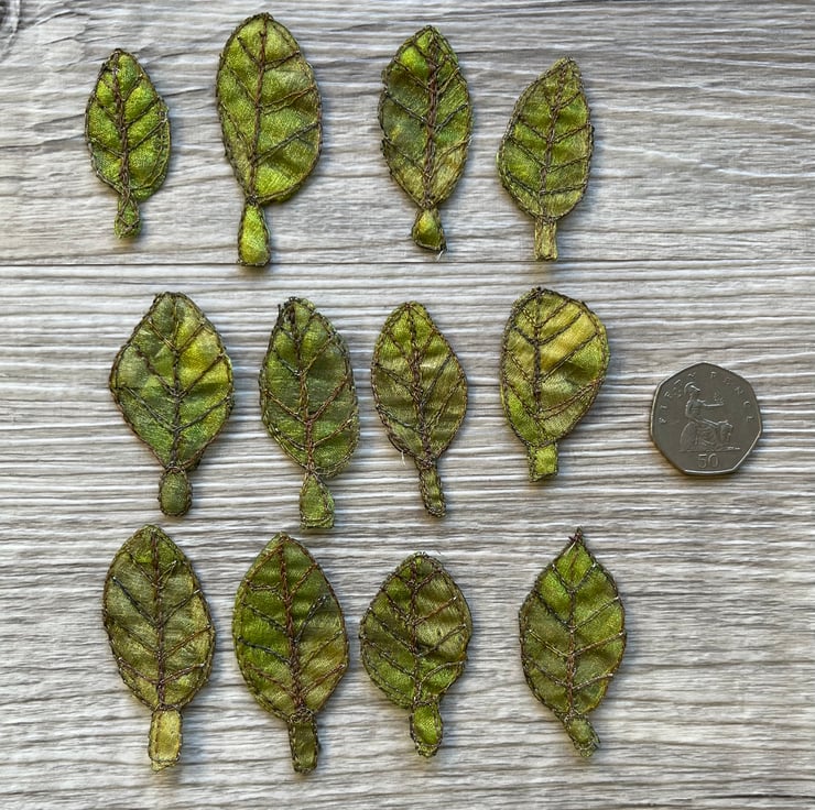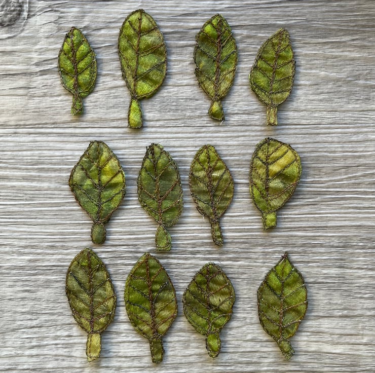 This pack of leaf embellishments have been made by using free motion embroidery techniques - drawing with the sewing machine. Each one is slightly different from another, giving them a quirky and organic look. They are embroidered in green thread.