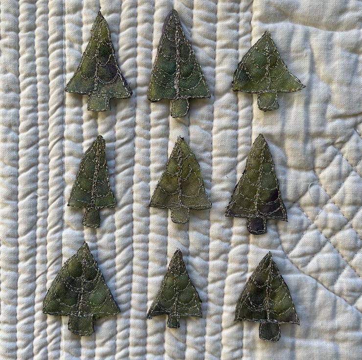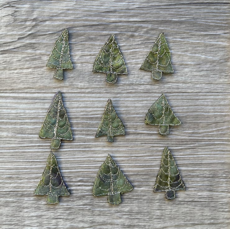 This pack of tree embellishments have been made by using free motion embroidery techniques - drawing with the sewing machine. Each one is slightly different from another, giving them a quirky and organic look. They are embroidered in silver metallic thread.