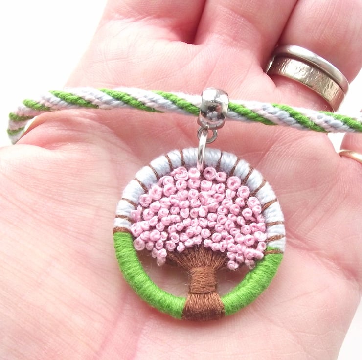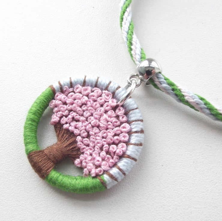 I made a Sakura (cherry blossom) pendant using some Dorset button techniques, with a multitude of pink French knots for the cherry blossom flowers. It has a brown trunk, a grass green base and pale blue for the sky. The whole pendant is worked in cotton thread on a brass ring.