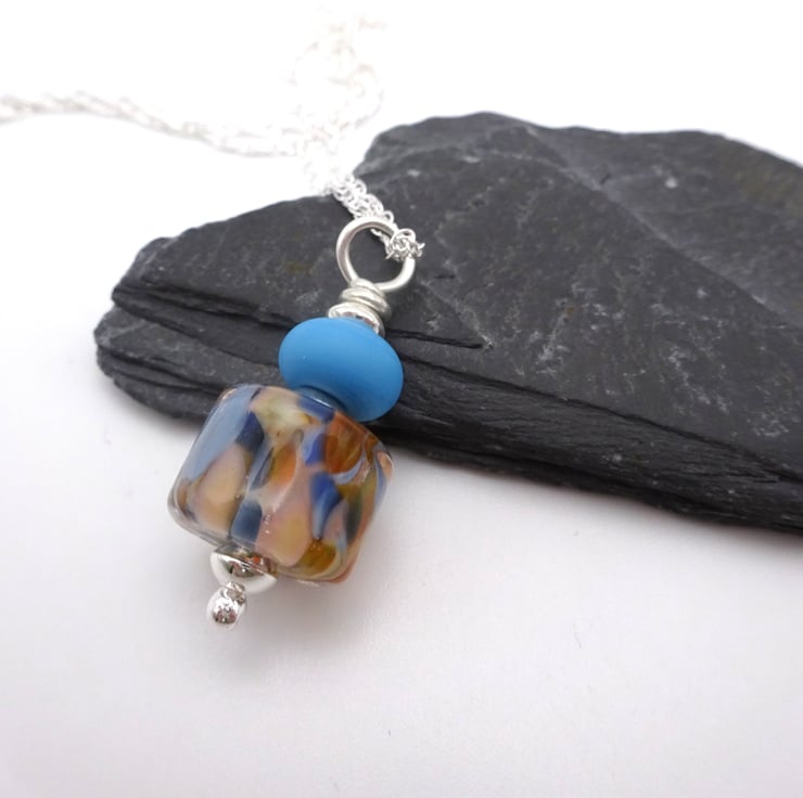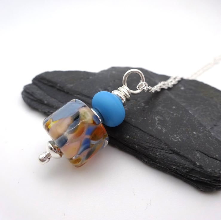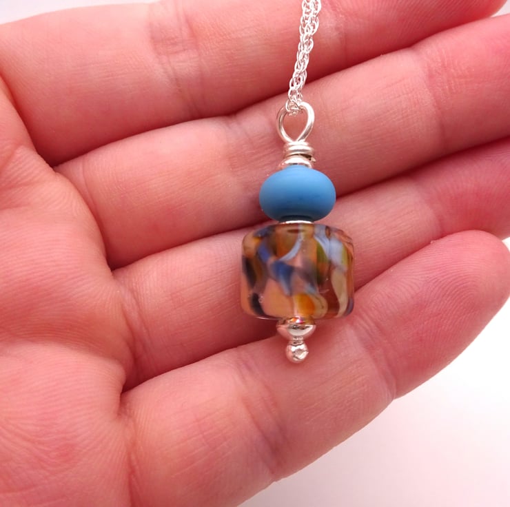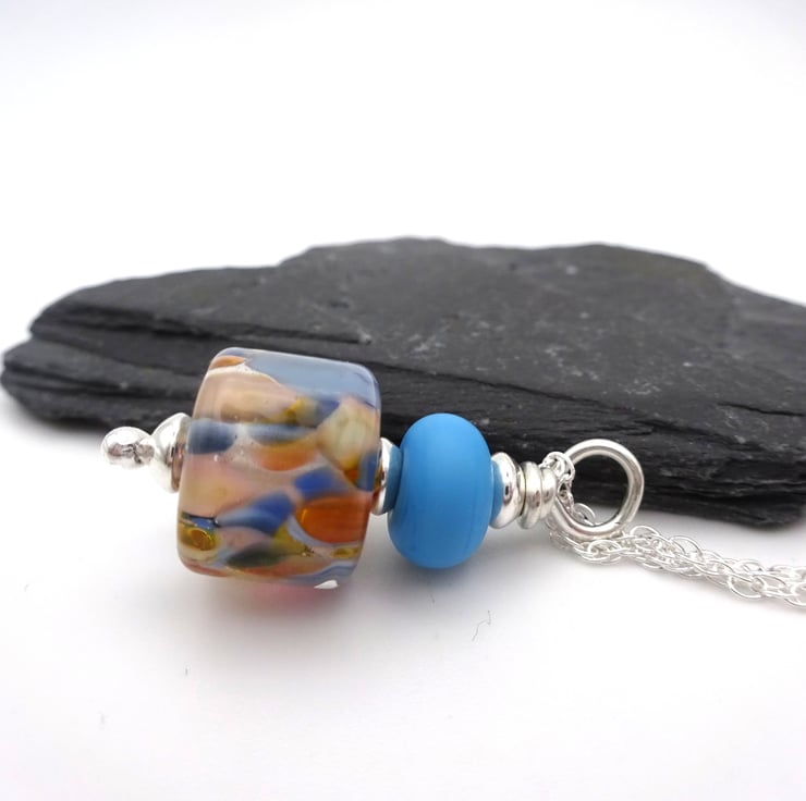 A sterling silver chain which features a handmade lampwork glass pendant made with blue and peach glass.