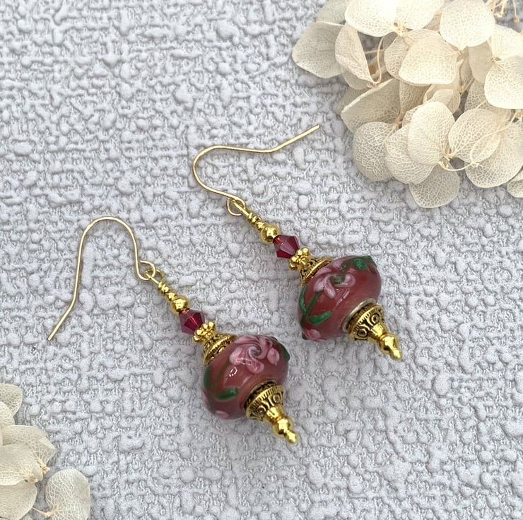 These pretty earrings are made using patterned handmade lampwork glass beads which have pink floral and leaf raised glass designs around the centre of the beads. The earrings also include gold-plated bead caps and tiny glass crystal beads. The earrings are finished with gold-plated ear wires and they are 4.5cm in total length.