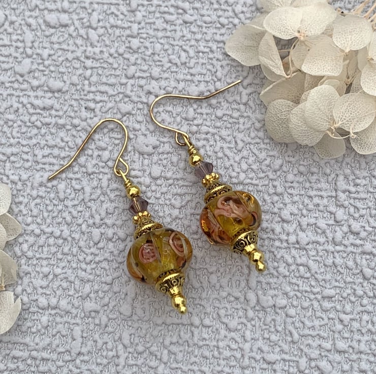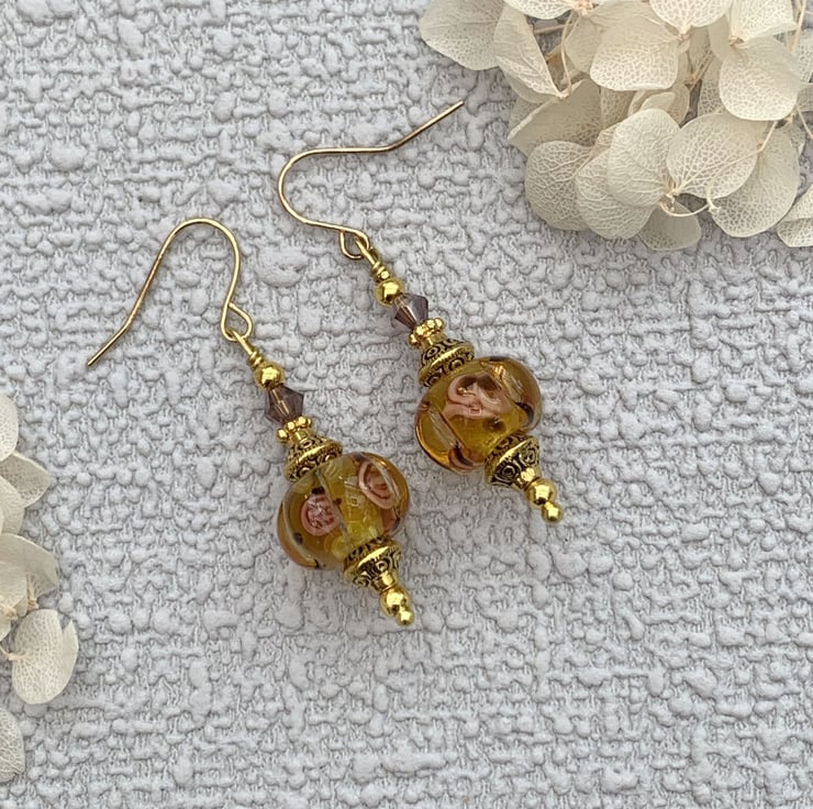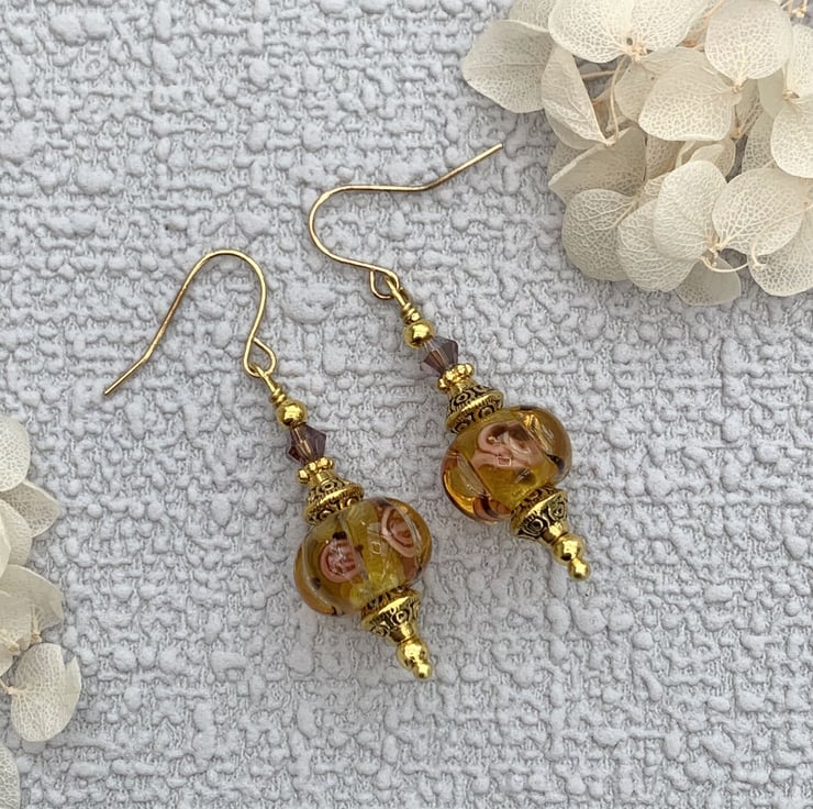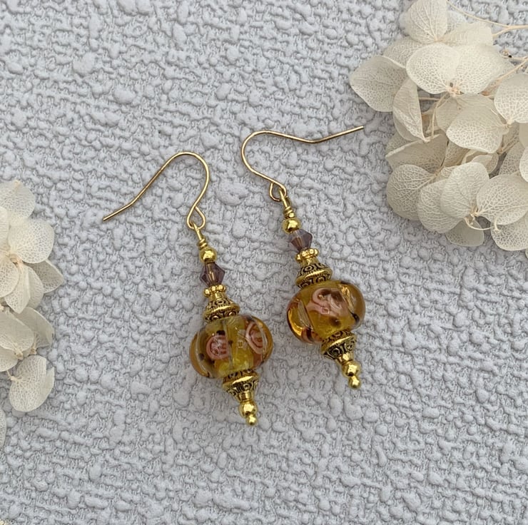 These pretty earrings are made using amber coloured patterned handmade lampwork glass beads that have a rose pattern design embellished inside the glass. The earrings also include gold-plated bead caps and tiny glass crystal beads. The earrings are finished with gold-plated ear wires and they are 4.5cm in total length..