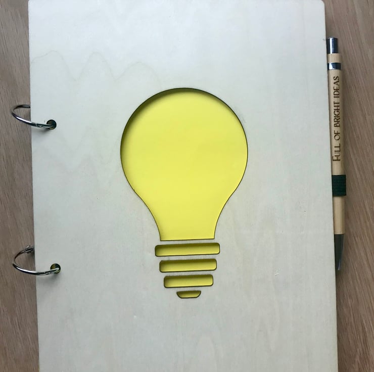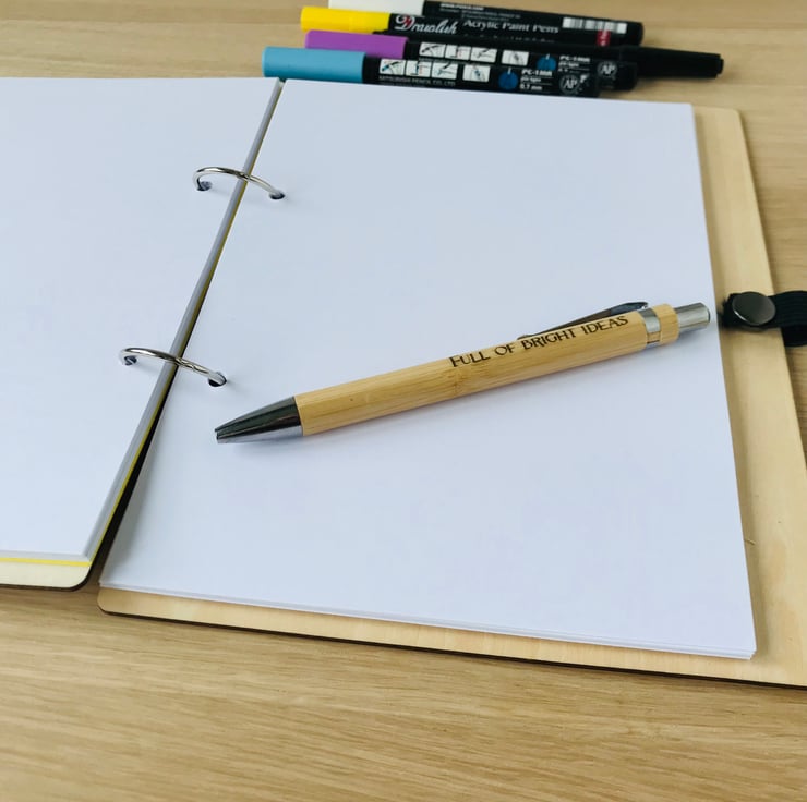 Our A5 bright idea wooden notebooks are complete with and engraved pen with “Full of bright ideas”