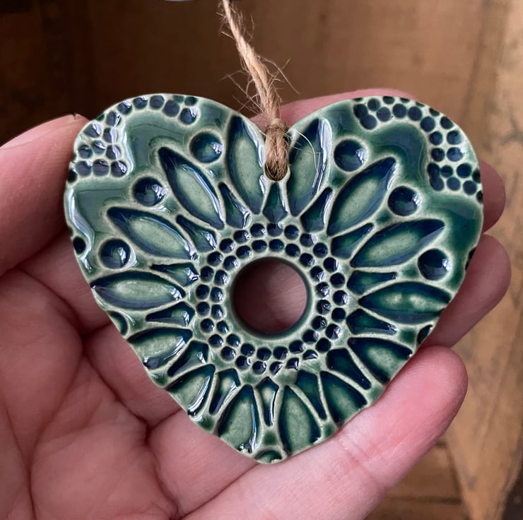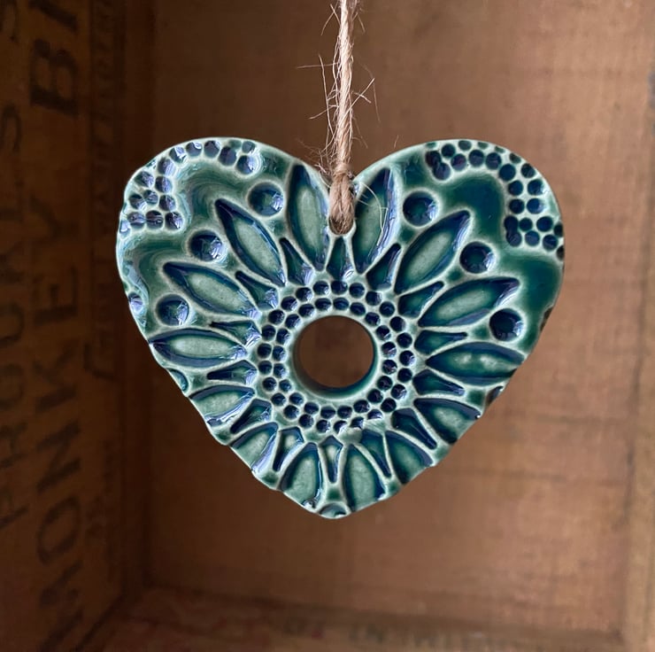 This little heart is made from white earthenware clay, imprinted with pattern and finished with a bright, glossy glaze. It has been fired twice, once to the bisque stage and then a second firing for the glaze. It measures 6 centimetres wide x 5.5cm height x 5mm thick. It can be hung outside.