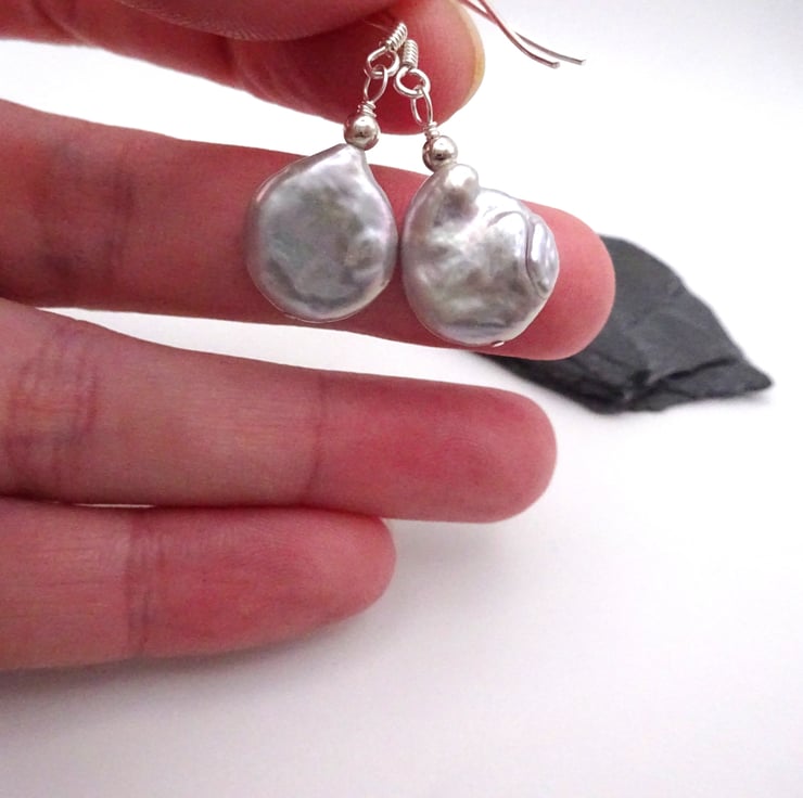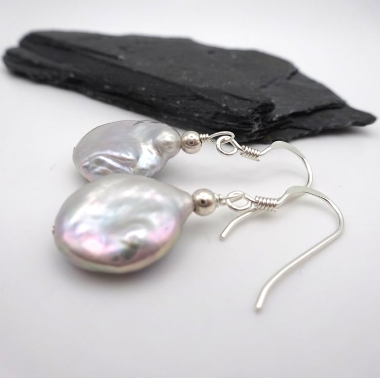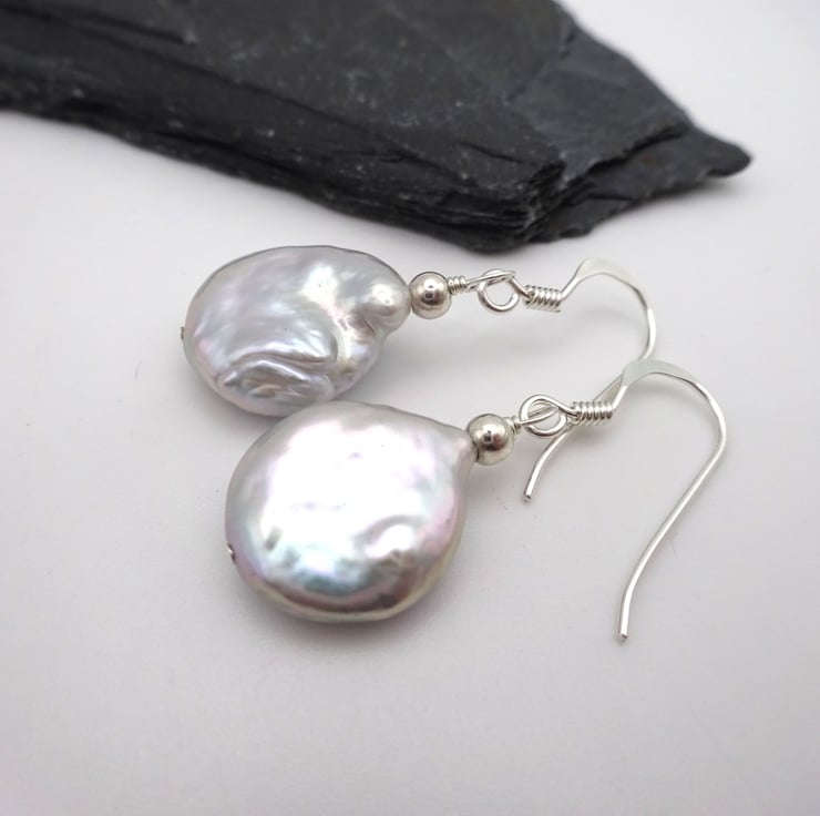 A pair of sterling silver earrings which feature silver coloured freshwater pearl beads.