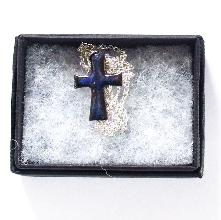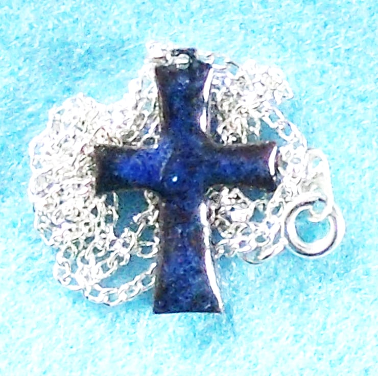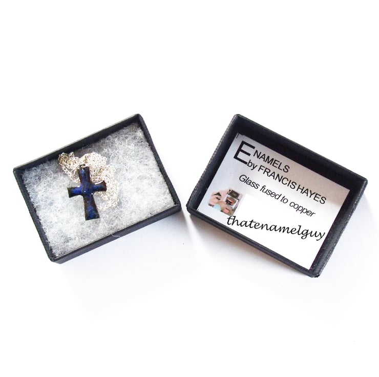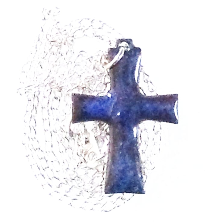 This cross measures 15mm by 23mm. The chain is silver-plated, 18 inches long. The cross is copper. I have built up several layers of clear enamel on the face then added a dark blue enamel. It has a single layer of dark enamel on the reverse.
