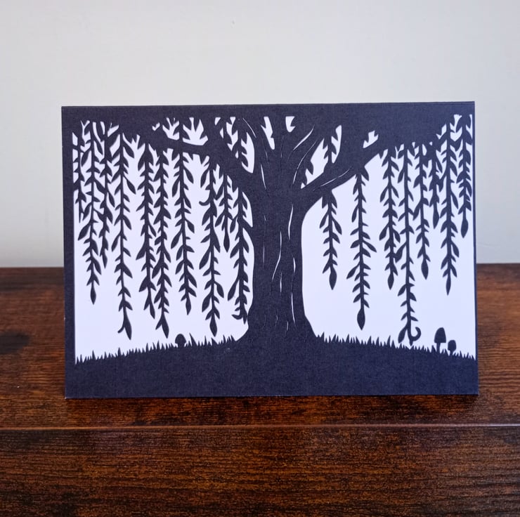 Eco-friendly printed greeting card. Image is of my original papercut of a willow tree, making this ideal to give for an anniversary or wedding!