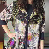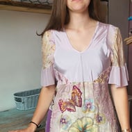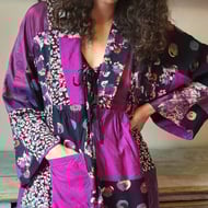 Large panels of plant dyed silk, with bundle dyed prints in Ahimsa soft silk top arms and bodice. Top front extends to sleeves (kimono style) multi dyed with top embroidery of abstract roses within Celtic Triskel symbols. Lower section has bundle dyed Habotai silk in multi tones lilac/pink/gold.