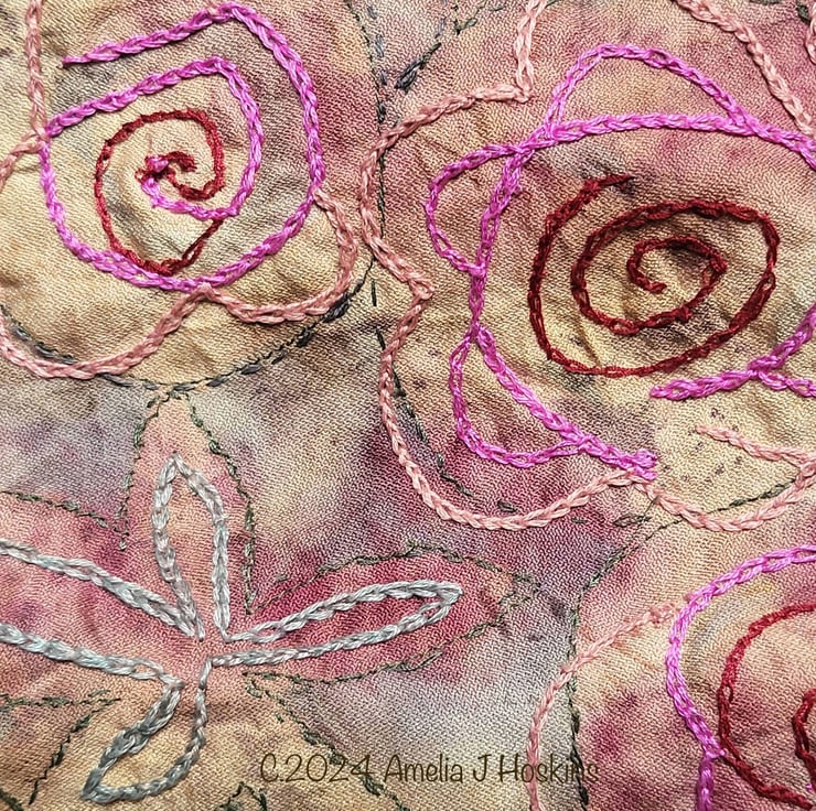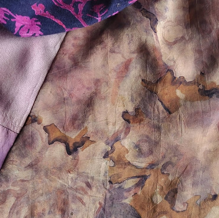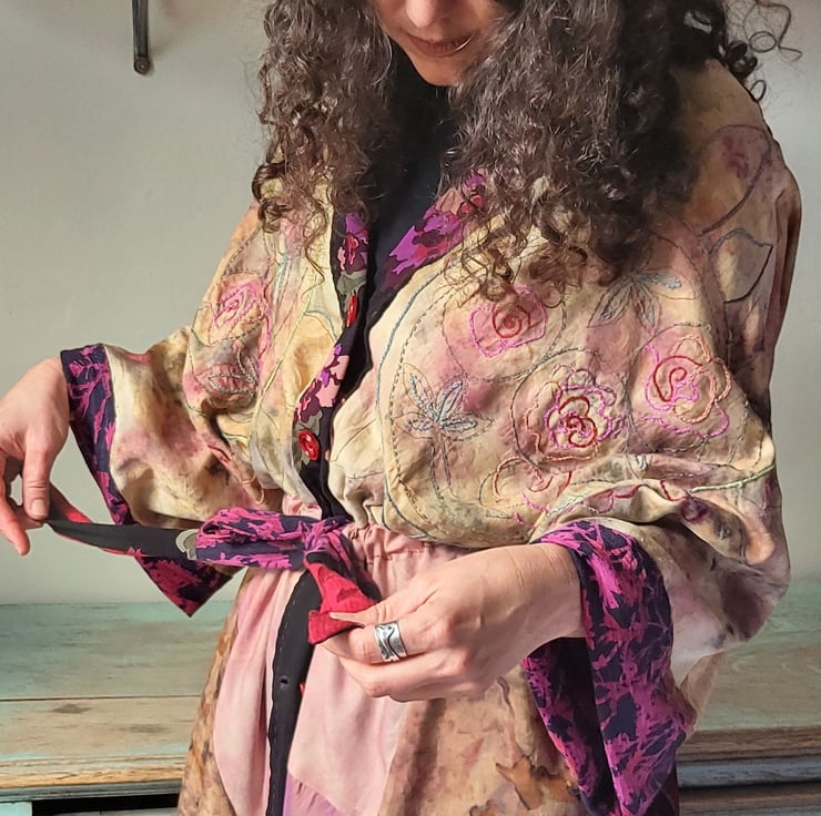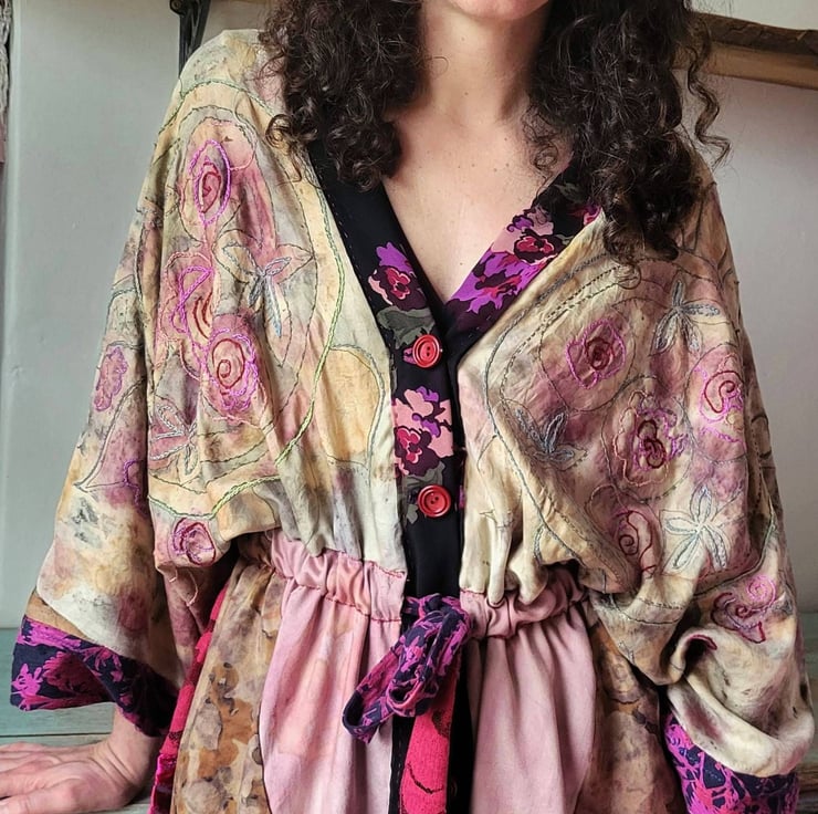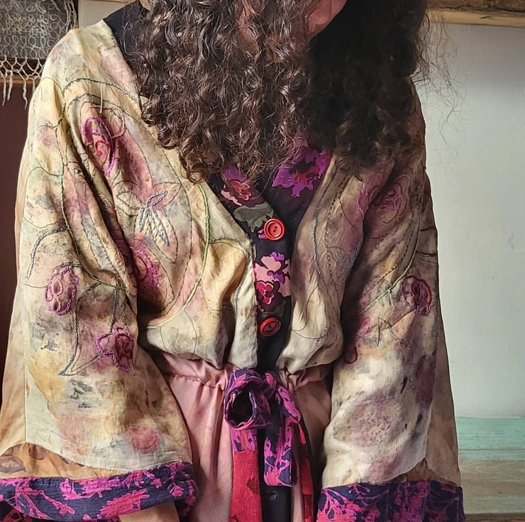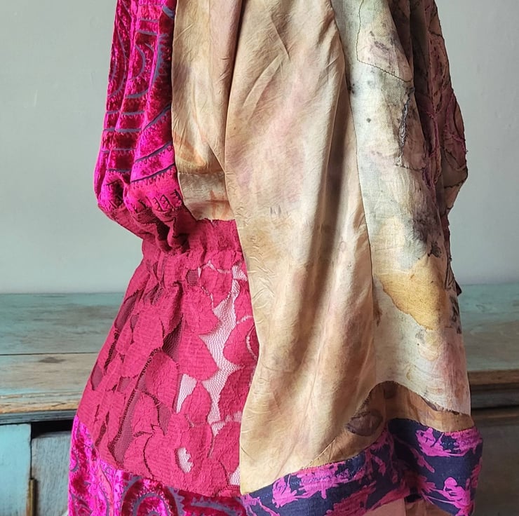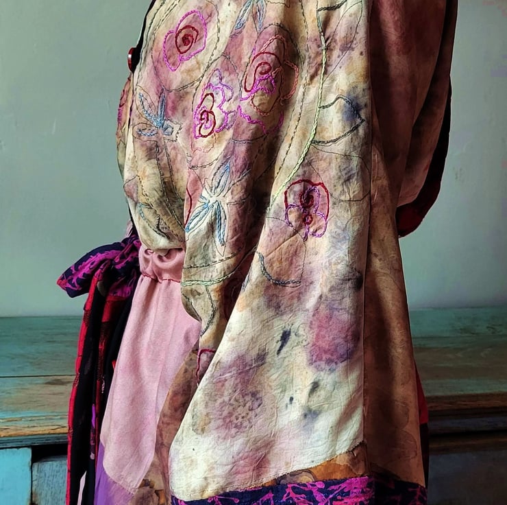 Large panels of plant dyed silk, with bundle dyed prints in Ahimsa soft silk top arms and bodice. Top front extends to sleeves (kimono style) multi dyed with top embroidery of abstract roses within Celtic Triskel symbols. Lower section has bundle dyed Habotai silk in multi tones lilac/pink/gold.
