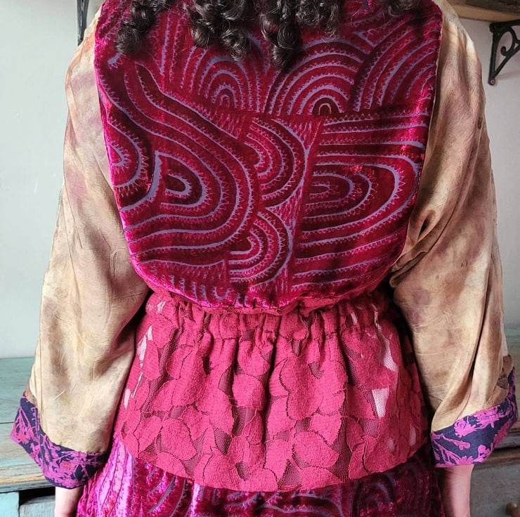 Back has large areas of crimson large flower motif lace with lower section in magenta crushed velvet.