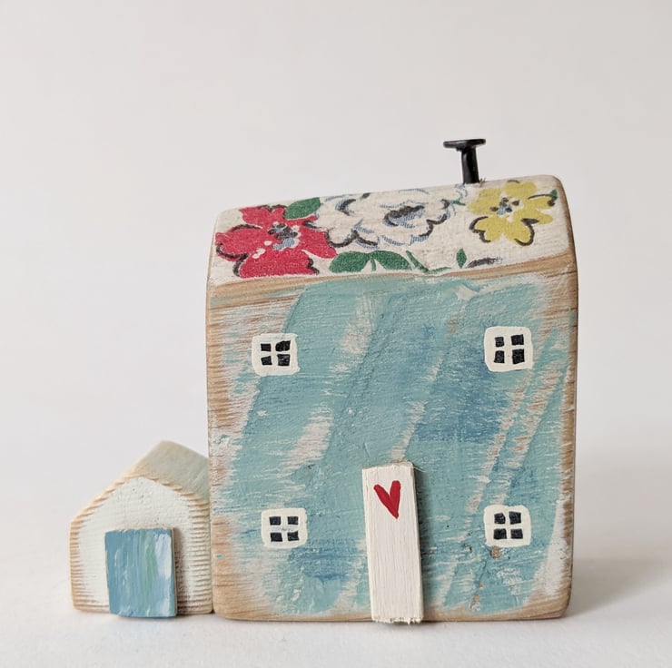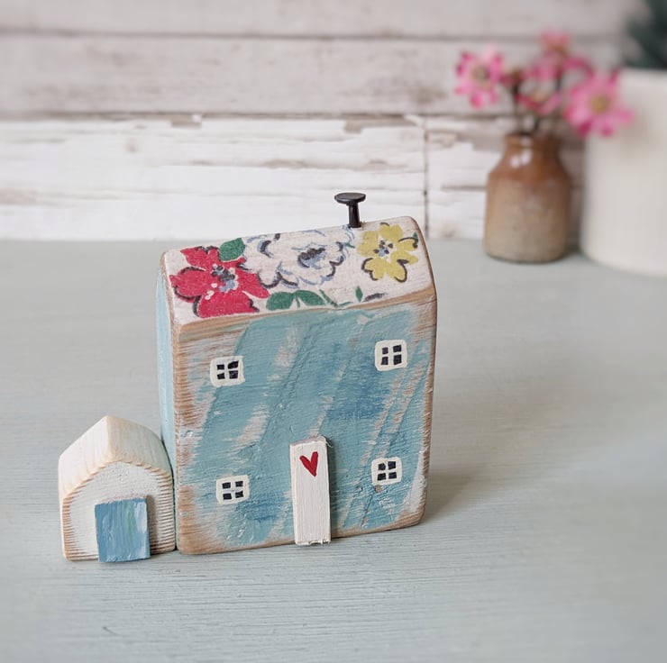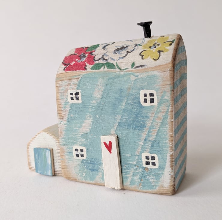 This little wooden house has been hand carved and painted and each piece is one of a kind.