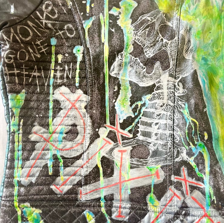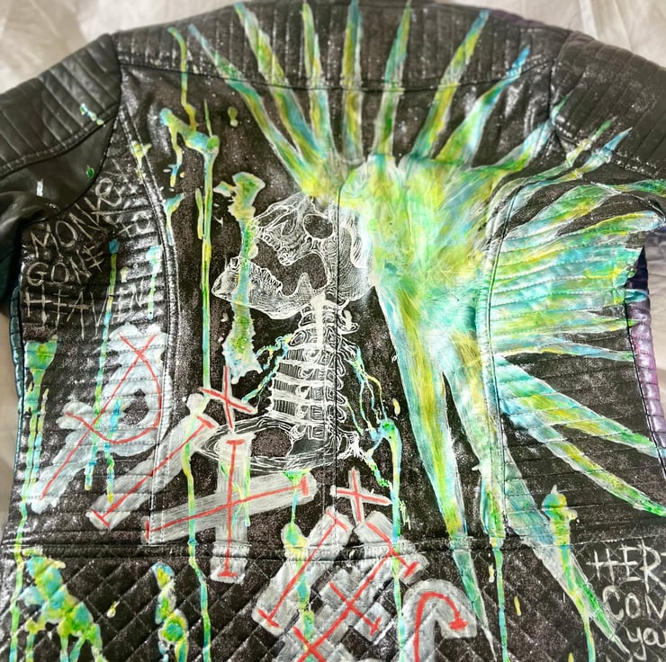 Enter the surreal world of the Pixies with "bone machine ," a one-of-a-kind, hand-painted leather jacket that blends punk spirit with chaotic beauty. This piece features an electrifying skeletal punk figure with a neon mohawk explosion, graffiti-style lettering, and haunting words like "Monkey Gone To Heaven" and "Here Comes Your Man"—all inspired by the band’s iconic lyrics and raw aesthetic.