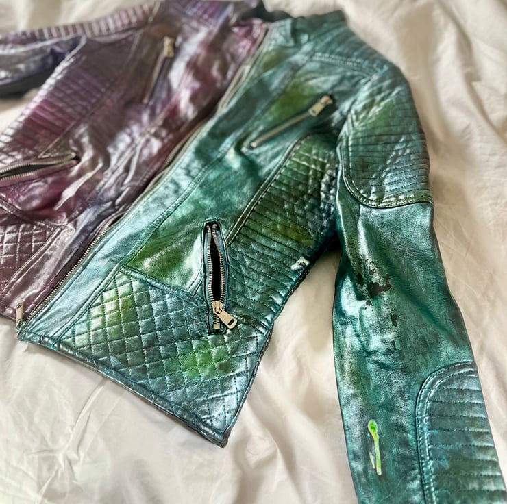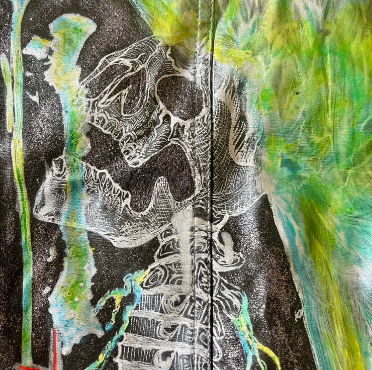 Crafted from 100% black quilted leather and drenched in fluorescent greens, whites, and eerie blues, this jacket is more than wearable art—it's a rebellion wrapped in a masterpiece. Every element is hand-painted, making it a true collector's piece for fans of the Pixies, punk rock, and underground street art.