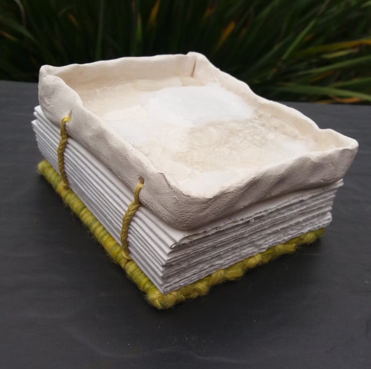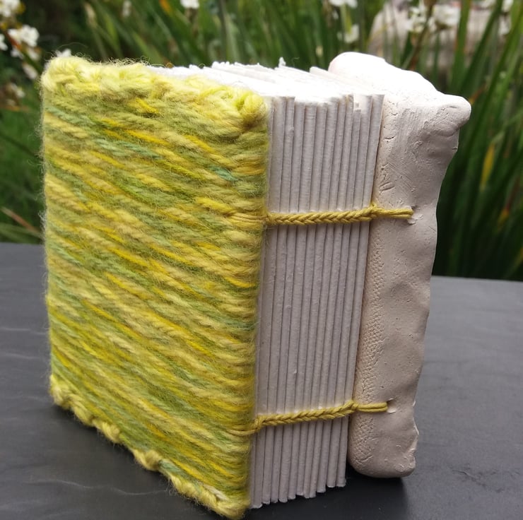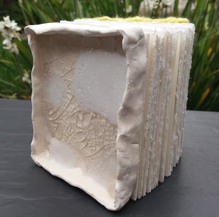 Handstiched Seaglass and Ceramic Journa, 48 pages, Coptic Bound to open out flat, with a Handwoven back cover, 9cm w x 10 1/2cm h x 5 1/2cm d.Using broken pieces of glass found on the seashore.