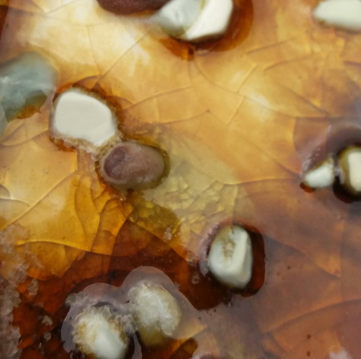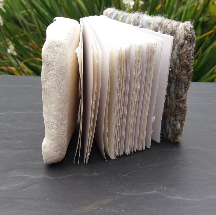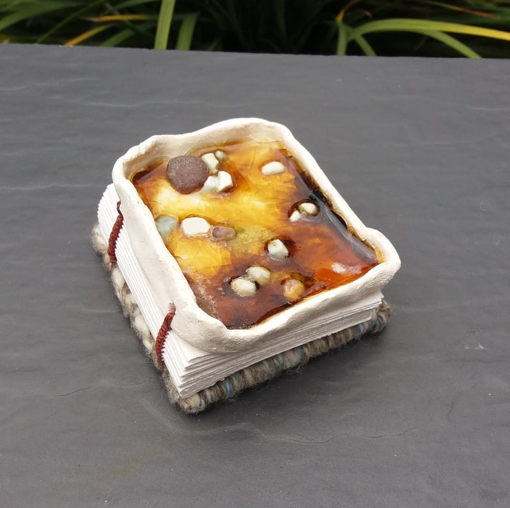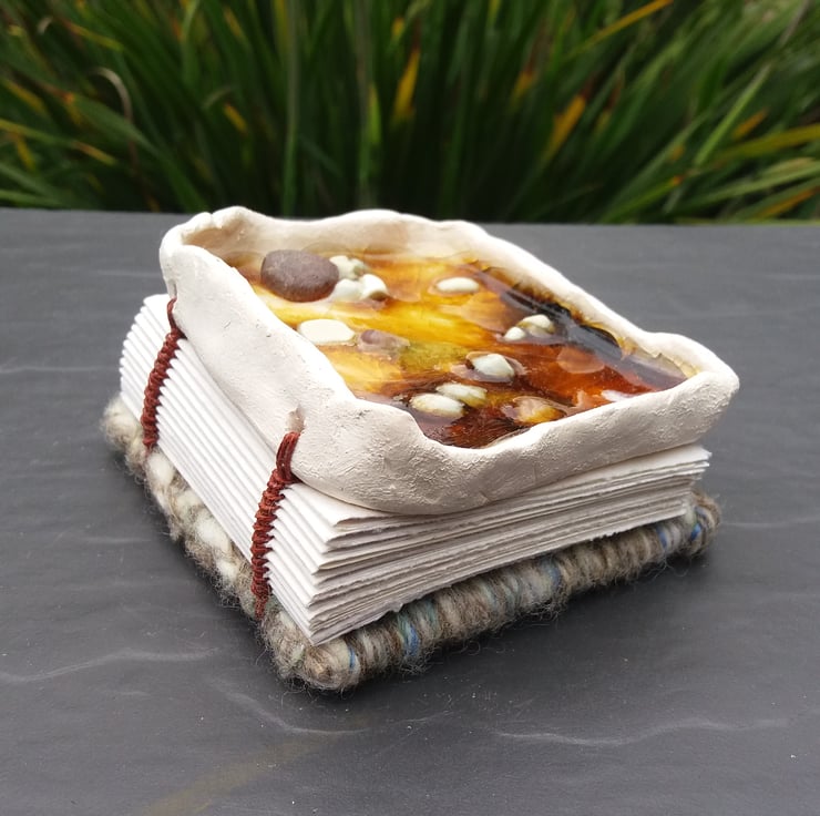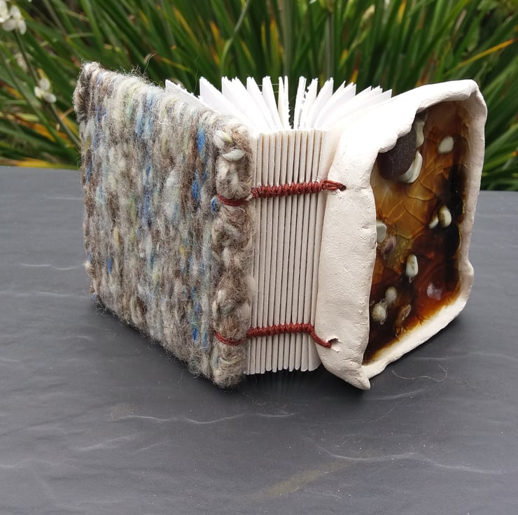 Handstiched Seaglass and Ceramic Journal, 48 pages, coptic bound to open out flat, with a handwoven back cover. 8 1/2cm w x 9 1/2cm h x 5 1/2 d. Using broken pieces of glass found on the seashore.