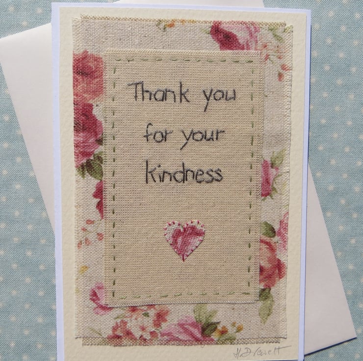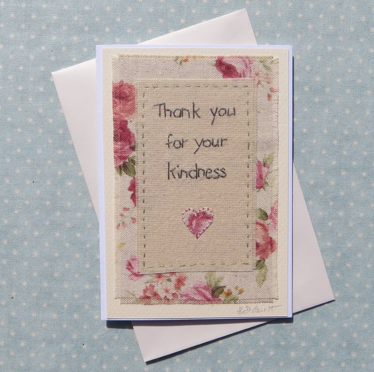 For this card I have embroidered the words 'Thank you for your kindness' adding a little applique heart. I then stitched the embroidered panel to a lovely piece of pretty linen fabric for the background. A special way to show your appreciation to someone who you wish to thank especially for their kindness.