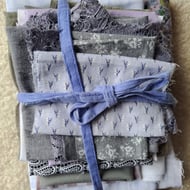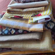 Nice big flowers parading around for full effect. These bold blooms make up a bundle of 11 pieces of rescued and remnant fabrics, mostly cotton, one linen and two linen mix. Lovely unabashed patterns and designs.