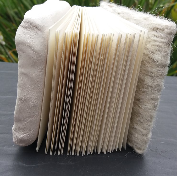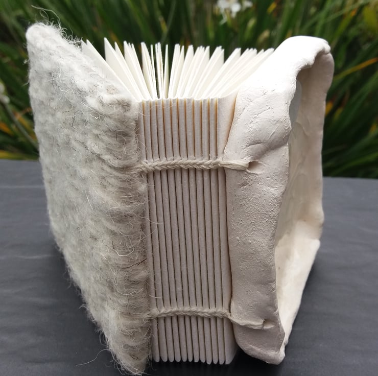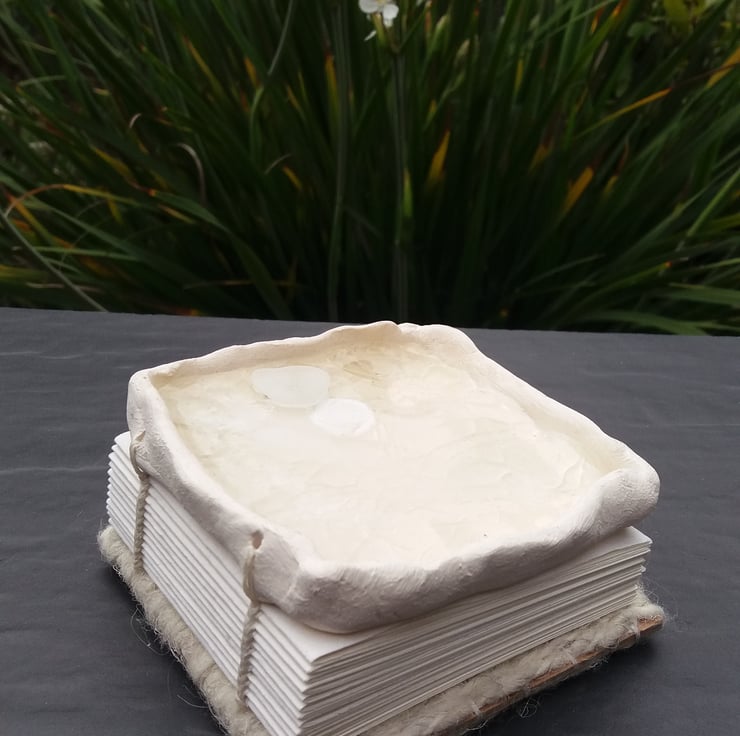 Handstitched Seaglass and Ceramic Journal, 48 pages, coptic bound to open out flat, with a handspun and woven back cover, 10cm w x 9 1/2cm h x 5 1/2cm d.. Using broken pieces of glass found on the seashore.