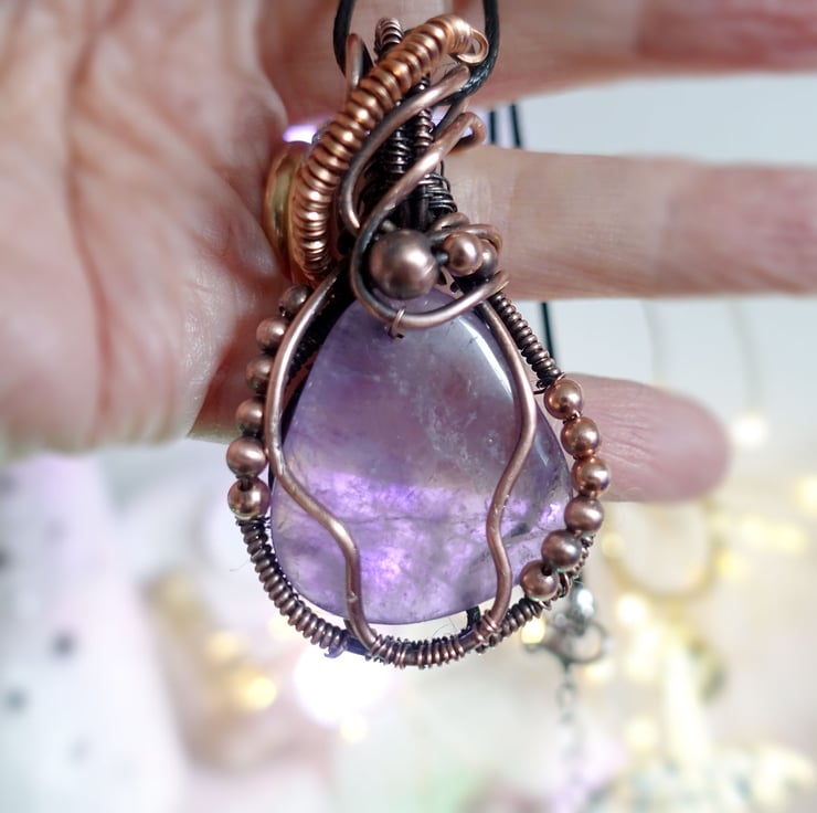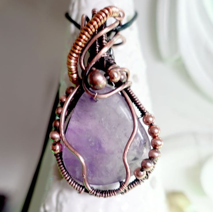 Semi translucent amethyst crystal wrapped in antiqued copper wire work.