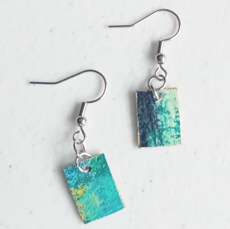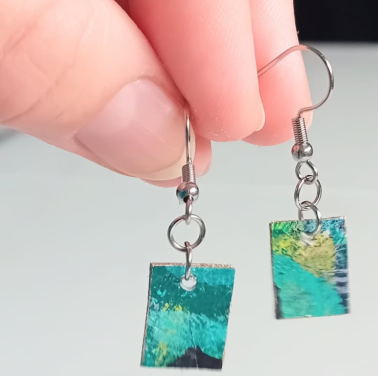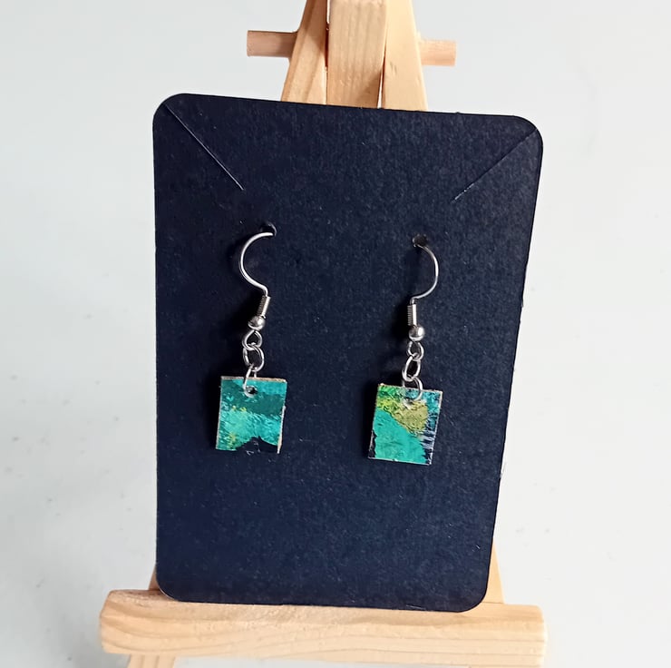 This is a pair of gorgeous, unique upcycled canvas earrings in a green colourway with gold finish to the edges. I am an artist and trim some paintings to mount, so this means those trims aren't wasted!
