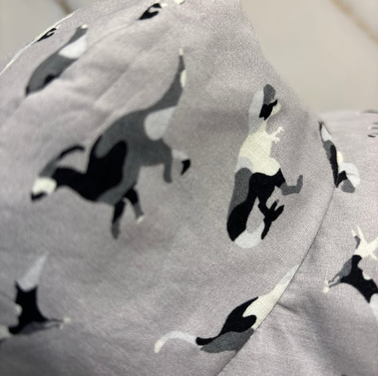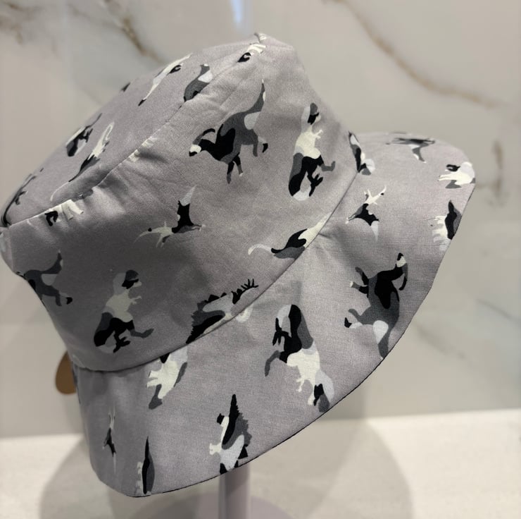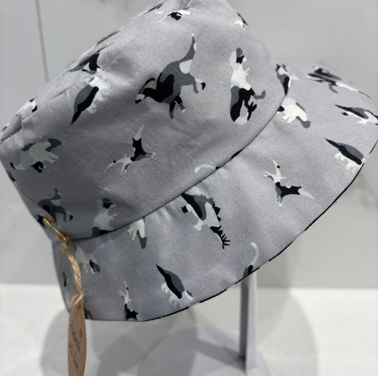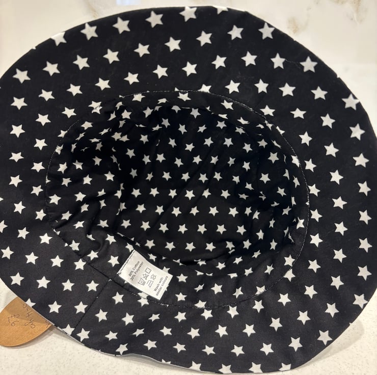 A dinosaur print hat with a fun black star lining.
