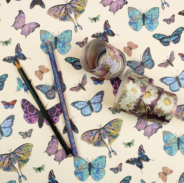I absolutely love butterflies and moths and so I decided to combine some of my colourful marbled designs to create some fanciful marbled butterflies and put them in repeat as a design for gift wrap.