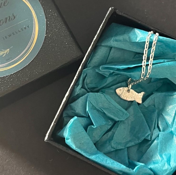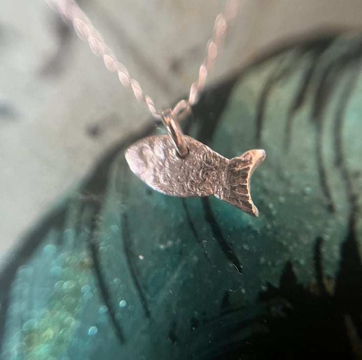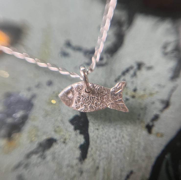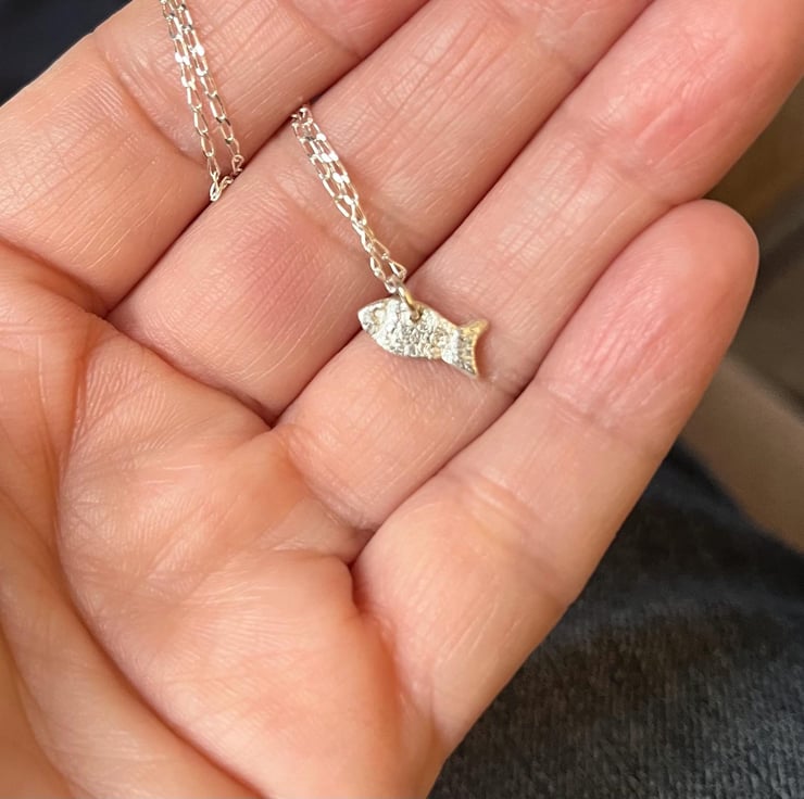 This tiny fish necklace is handmade from fine silver. There is a choice of finish, either a sterling silver chain 16 or 18" or a black obsidian choker 16" which has an extension chain also.