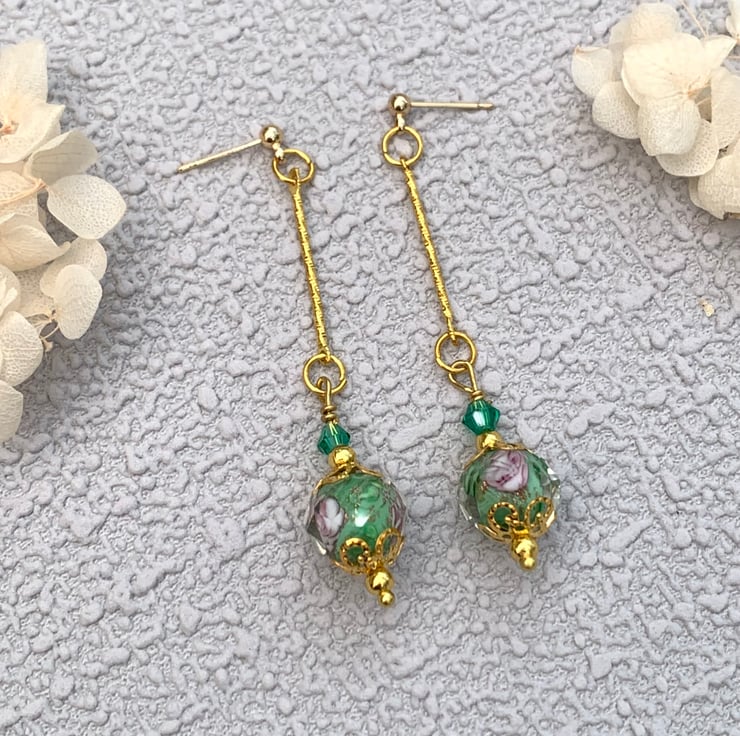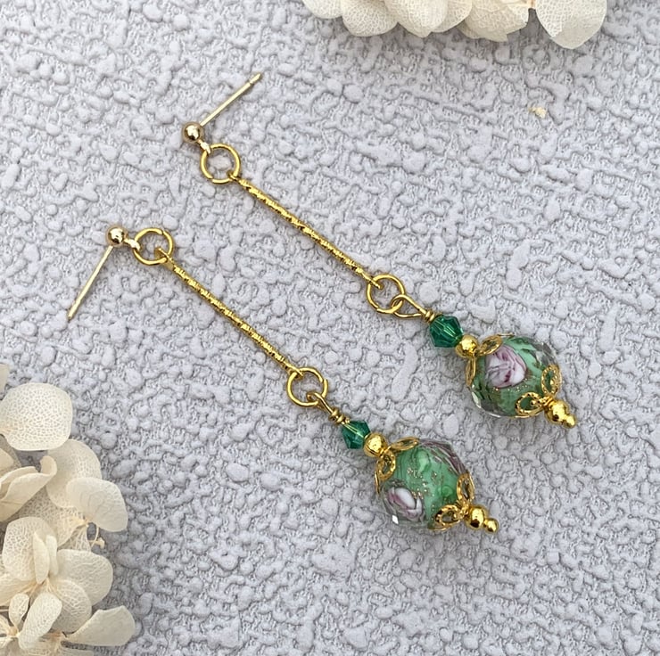 These pretty earrings are made with green rose patterned lampwork glass beads as the feature bead. They are mixed with tiny gold-plated beads and tiny glass crystal green beads as well as tiny delicate gold bead caps. They are suspended from gold tone patterned connectors and finished with gold-plated earring posts. The earrings are 6cm in total length.