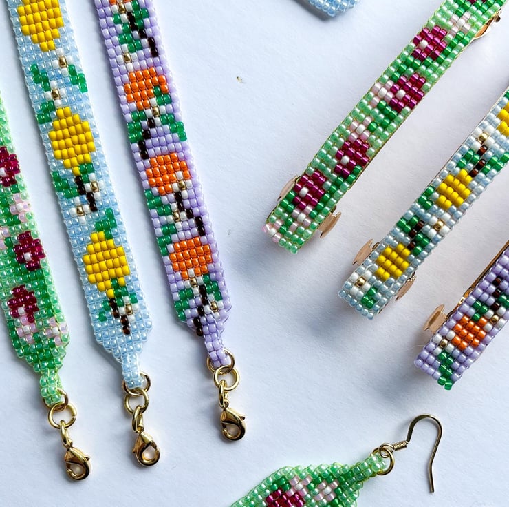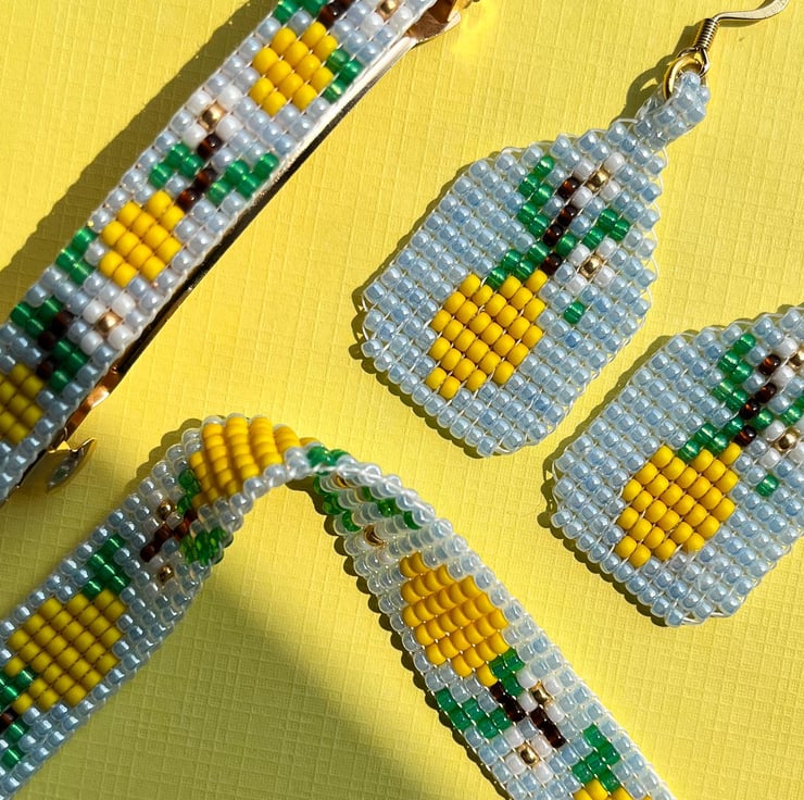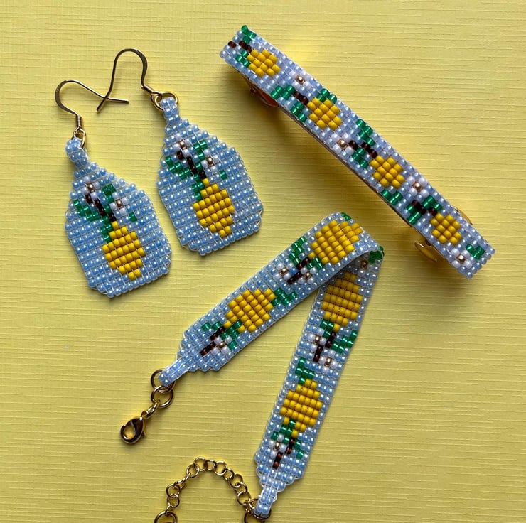 Each earring is carefully handwoven on a loom using premium Miyuki glass seed beads. Zesty yellows and fresh greens sit against a soft sky blue background, finished with 18k gold-plated hooks for comfort and shine. Lightweight, vibrant, and full of personality, they’re perfect for gifting or styling with your favourite summer dress.