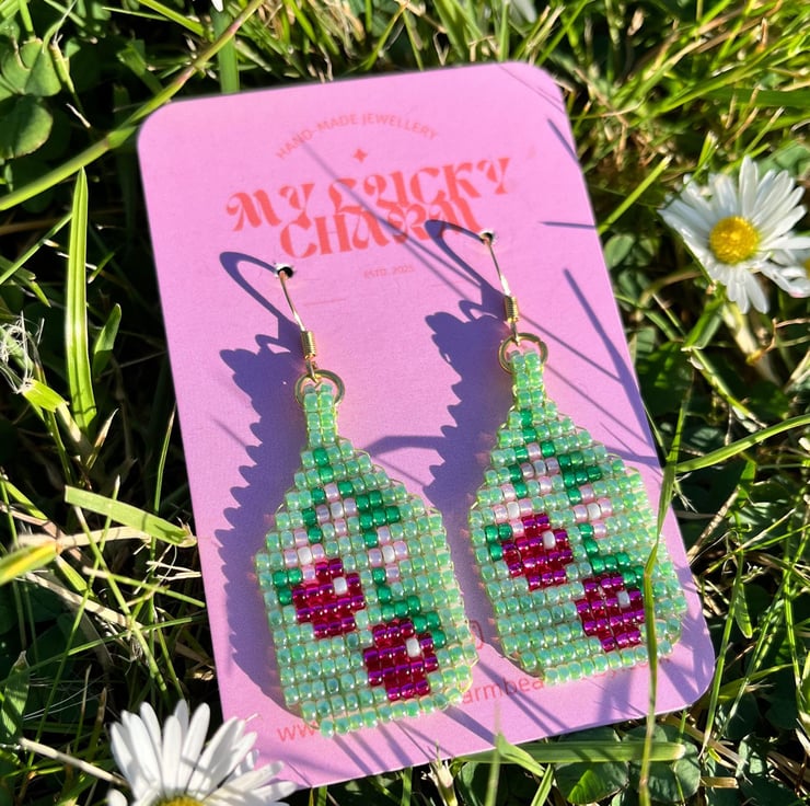Add a playful pop of pink to your look with these handmade cherry blossom beaded earrings, inspired by the sweet charm of English country gardens in bloom. Featuring bright pink cherries and delicate blossoms on a soft mint green base, these dainty dangles bring a touch of cottagecore romance to your outfit.