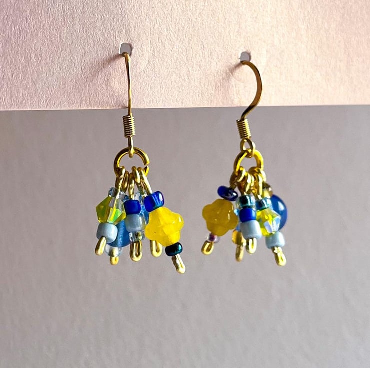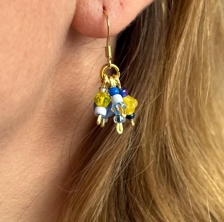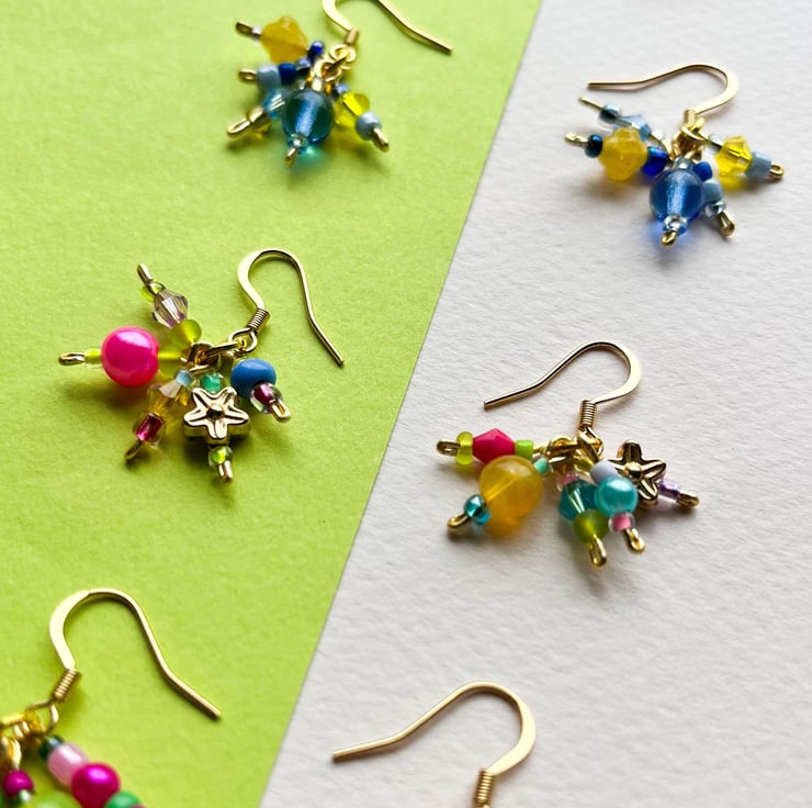 Every pair is handmade and truly one of a kind. Your earrings will share the same style and sunny colour palette as those pictured, but the exact beads and arrangement will vary—making your pair completely unique.