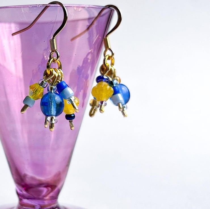 Add a cheerful burst of colour with these blue and yellow bead drop earrings. With gold-plated hooks and bright beaded drops, they’re perfect for everyday wear or as a sunny little gift for someone special.