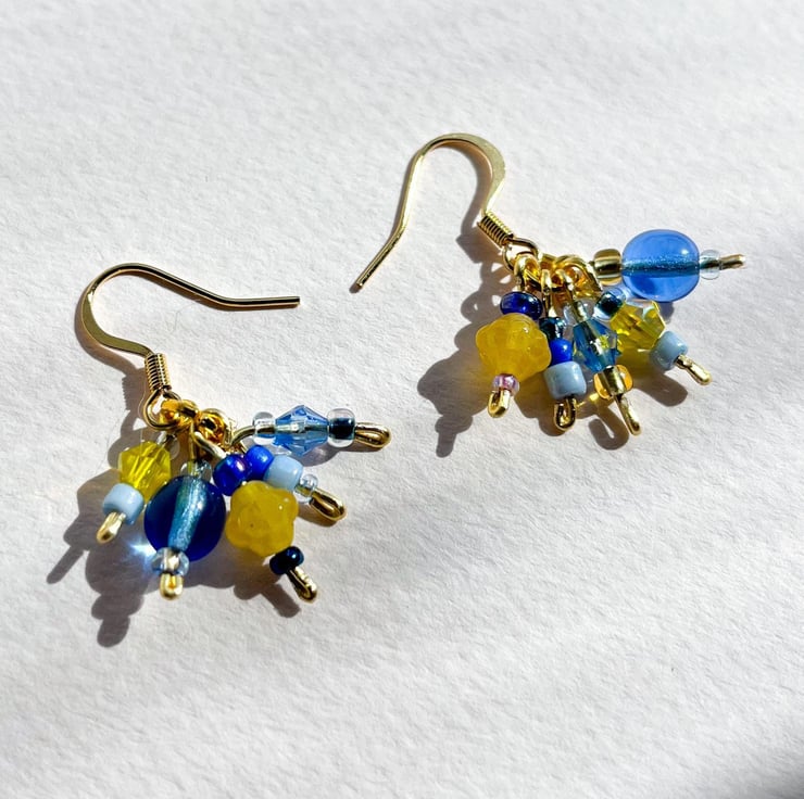 Each pair is made from a playful mix of blue and warm yellow beads in a range of shapes and sizes, creating a joyful confetti-style effect full of colour and energy.