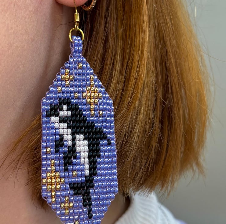 These loom-woven orca whale earrings are a true statement piece—bold, beachy and full of boho charm. Featuring a striking orca design set against a rich purple background with tiny gold stars, each earring is intricately handmade on a beading loom using high-quality Miyuki glass seed beads.