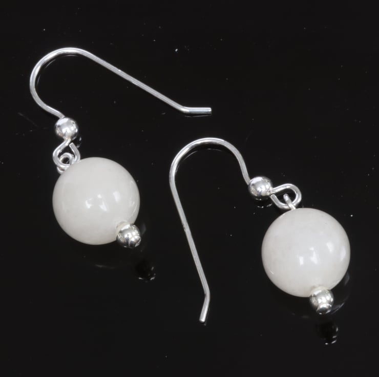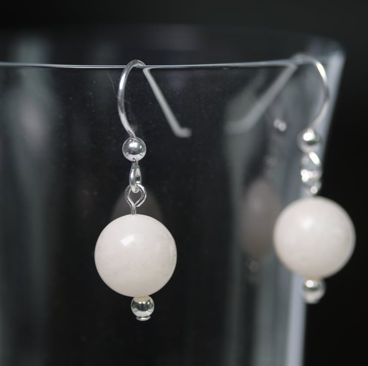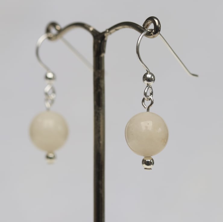 Some straightforward little earrings that will work for almost any occasion. They are made from white agate beads which I found in a little beadshop whilst on holiday in Canada. I have put them on sterling silver wires hanging from good quality sterling silver earring hooks.